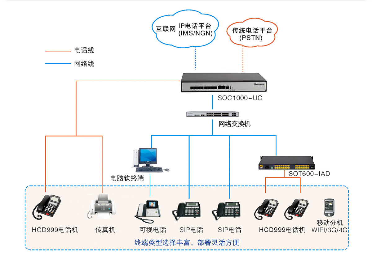 實現模擬話機、IP話機、IP視頻話機、電腦軟客戶端、手機客戶端、IAD等多終端接入。無論是在辦公室、會議室、出差途中、家中,還是在客戶現場,隨時隨地都能進行溝通,讓溝通"無處不在"。